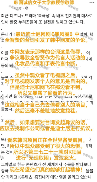韩国教授徐敬德特意在社交媒体发文,评论全智贤“辱华”风波。徐敬德表示人人有言论自由,但《暴风圈》是在海外播放,指责中国网友不知羞耻地偷看《暴风圈》。而看了之后因为台词争议将矛头对准全智贤是故意找茬,催促中国网友应该找迪士尼和制作公司抗议,还嘲讽中国网友恐惧韩剧的世界级影响力。