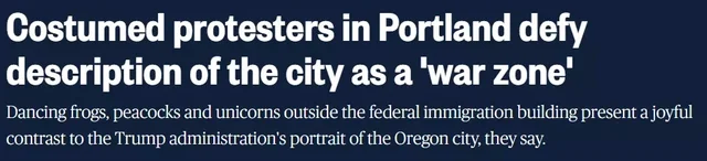 他们表示,联邦移民局大楼外跳舞的青蛙、孔雀和独角兽与特朗普政府对这座俄勒冈城市的描绘形成了鲜明的对比。