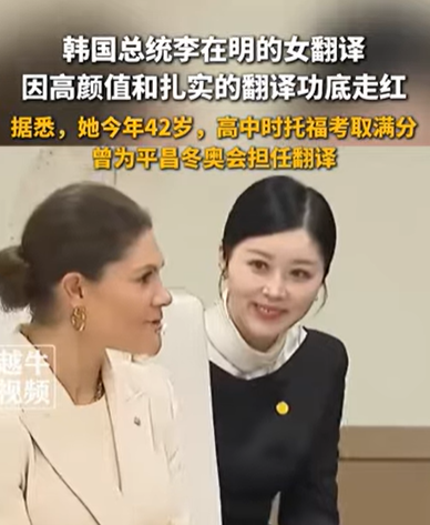 据海客新闻援引MBC电视台报道,10月15日,韩国总统李在明会见瑞典女王储维多利亚时,现场女翻译因高颜值和扎实的翻译功底走红。