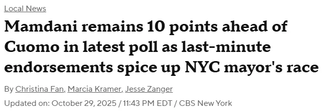 又一项新的民调显示,在纽约市长选举中,无党派候选人安德鲁·科莫(AndrewCuomo)目前仅以10个百分点之差落后民主党领跑者佐赫兰·曼达尼(Zohran Mamdani)。