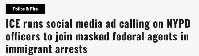 据一则新发布的社交媒体广告显示,美国移民与海关执法局(ICE)正试图招募纽约市警察局(NYPD)警员加入其颇具争议的执法队伍。