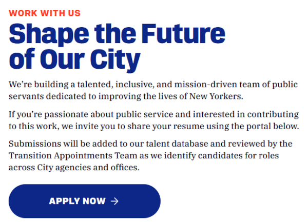 市长当选团队正在继续寻找人才,在艺术与文化、气候、刑事司法、经济发展、卫生、住房、移民司法、公共安全、交通、青年与教育等领域工作。